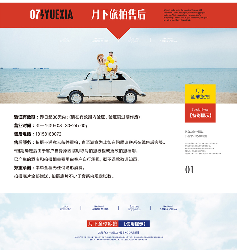 拍摄地(省/地区): 上海 山东 海南 重庆 云南 青海拍摄地(市/景点): 上海 青岛 三亚 重庆 丽江 大理 西双版纳 香格里拉(迪庆) 海南增值服务: 不满意重拍 分阶段付款 包含住宿 底片全送 接机服务 无隐形消费 送微电影拍摄天数: 1天拍摄底片数: 101-200张其他产品数: 4件相册数量: 4本化妆造型数: 8组以上